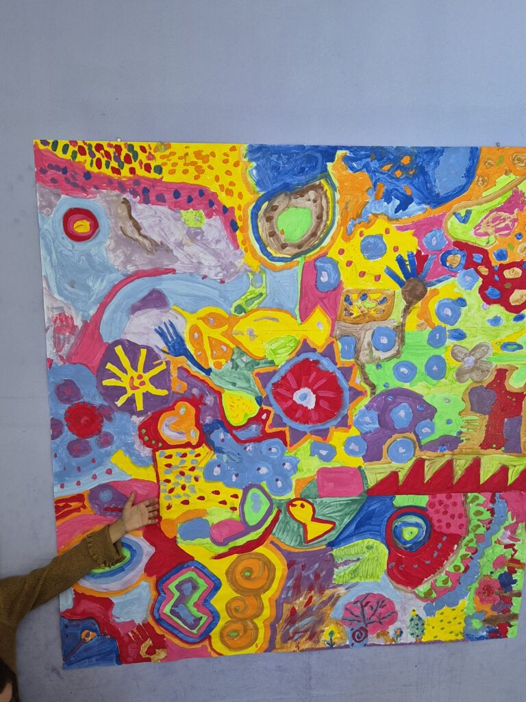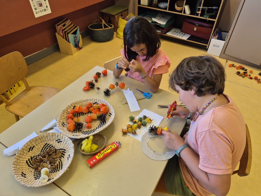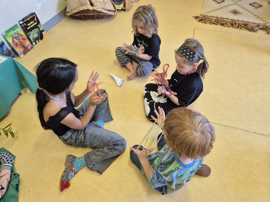 Sei es beim Malen des riesigen, bunten Gruppenbilds, entstanden zu klassischer Musik, als die Kinder einander ganz leise fragten: „M. darf ich das hellblau, wenn du dann damit fertig bist?“ „S. reichst du mir bitte das dunkelgelb rüber, danke“ oder beim Figuren üben mit der selbstgedrehten Wollkordel, wo fleissig einander gezeigt, geholfen und gemeinsam geübt wird. Bei diesen kreativen Tätigkeiten kann jedes Kind gut mithalten, ganz unabhängig von seiner Schulstufe. So hatte einmal der Jüngste seine mit Natur-Herbstmaterial aufgefädelte Girlande geschickt als Erster beendet und die Jüngeren stehen den Älteren im Erfassen des Ablaufs der Fadenspielfiguren in nichts nach.